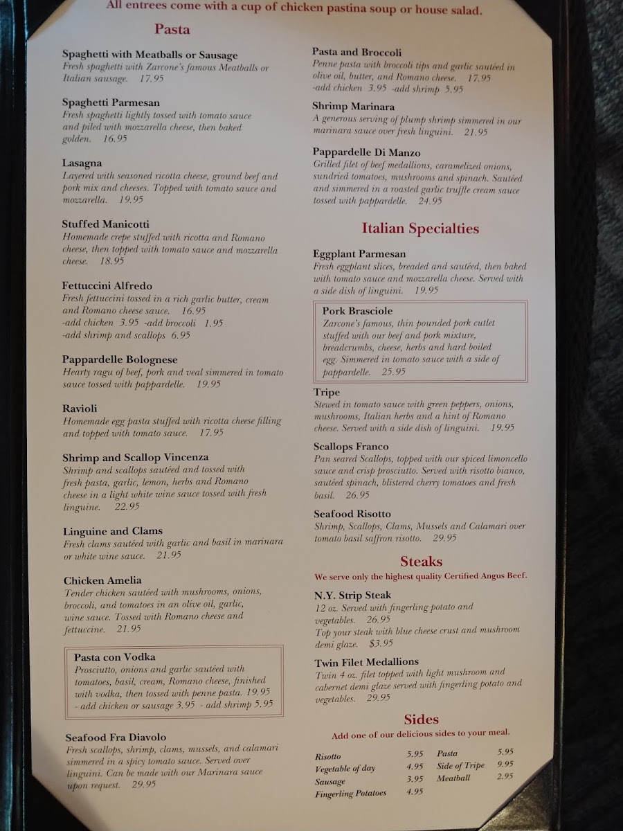 Zarcone's famous, thin pounded pork cutlet stuffed with our beef and pork mixture, breadcrumbs, cheese, herbs and hard boiled egg. Simmered in tomato sauce with a side of pappardelle